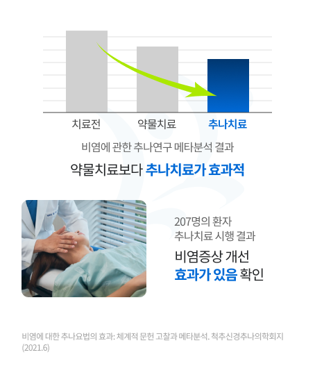 추나를 적용하여 휘어진 코를 바로잡아 비강을 확장시키고 두개골의 부정렬을 교정하여 잘 낫지 않는 비염을 치료합니다.