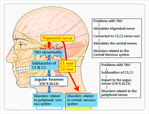 얼굴의 턱관절은 머리와 경추 2번을 매개로 전신과 연결되어 있습니다.