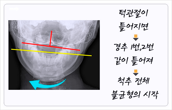 턱 위치가 틀어지면 주변 근육이 비대칭으로 긴장하고, 그 긴장이 경추 2번 주변까지 이어지죠.
