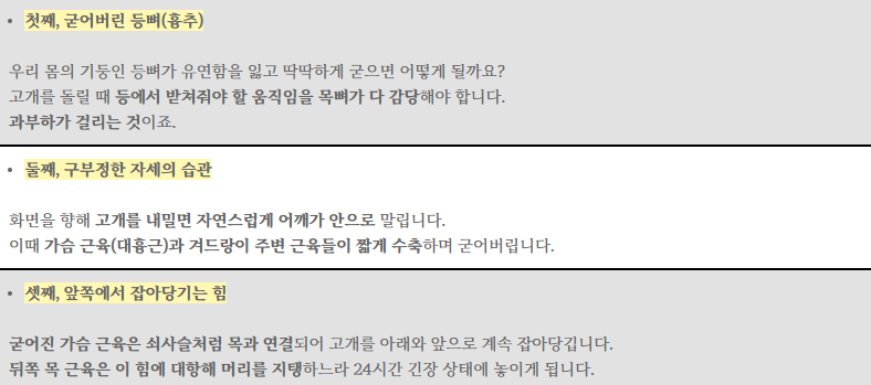 우리가 컴퓨터 작업을 하거나 스마트폰을 볼 때 자세를 떠올려 보시면 이해가 쉬운데요.