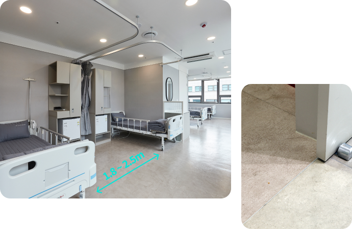 법정 기준 (1.5m) 보다 훨씬 넓은 2.5m의 침상 간 공간으로
