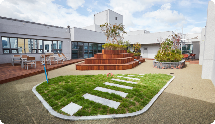 옥상 정원에 24시간 운동 가능한 트랙을 적용하였고, 재활 중 넘어져도 다치지 않는