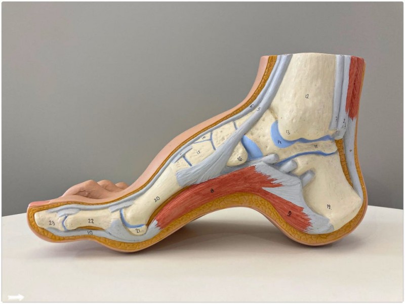 족저근막은 발뒤꿈치에서 발가락 쪽으로 이어지는 두꺼운 인대 조직입니다.