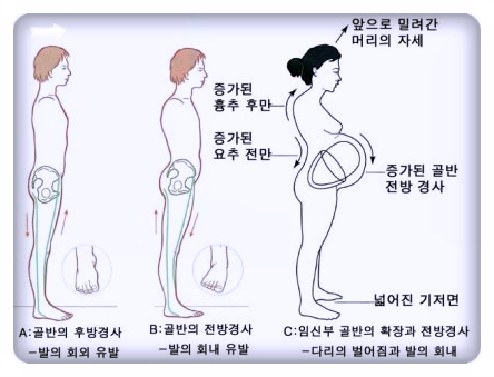여기에 배가 앞으로 나오면서 자세가 달라지고, 몸의 중심이 앞쪽으로 쏠리게 되죠.
