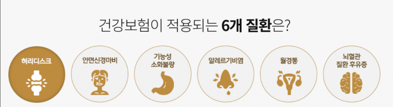 허리디스크, 월경통(생리통), 안면신경마비(벨마비), 기능성 소화불량, 알레르기 비염, 뇌혈관질환 후유증