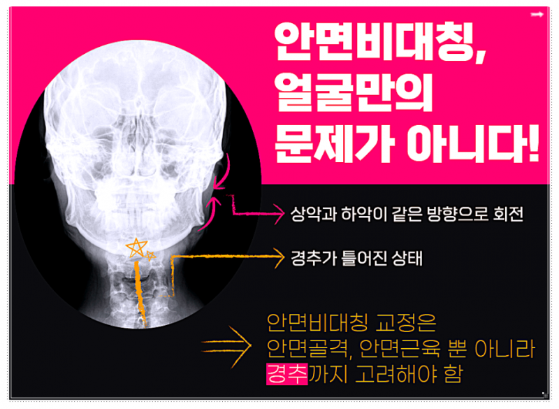 안면 비대칭도 마찬가지입니다. 이 문제를 방치하면 턱관절에 소리나 통증을 유발할 수 있고, 그 영향은 생각보다 더 크게 다가옵니다.