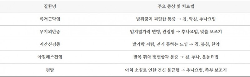 지금부터 족저근막염, 무지외반증, 평발과 같은 대표적인 족부 질환과