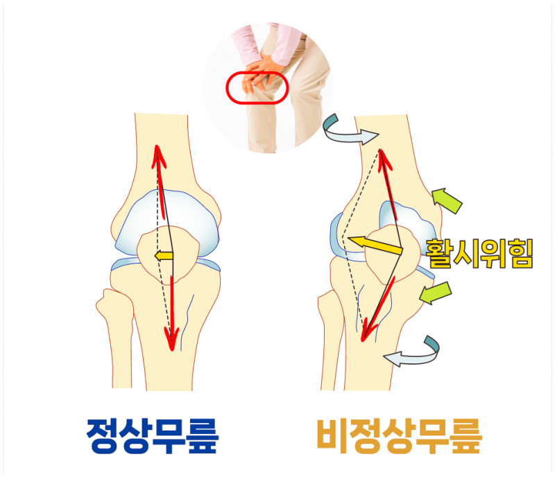 다리가 바깥쪽으로 틀어지거나 체중이 한쪽으로 실리면 무릎 뒤쪽 특정 부위만 계속 압박을 받게 됩니다.
