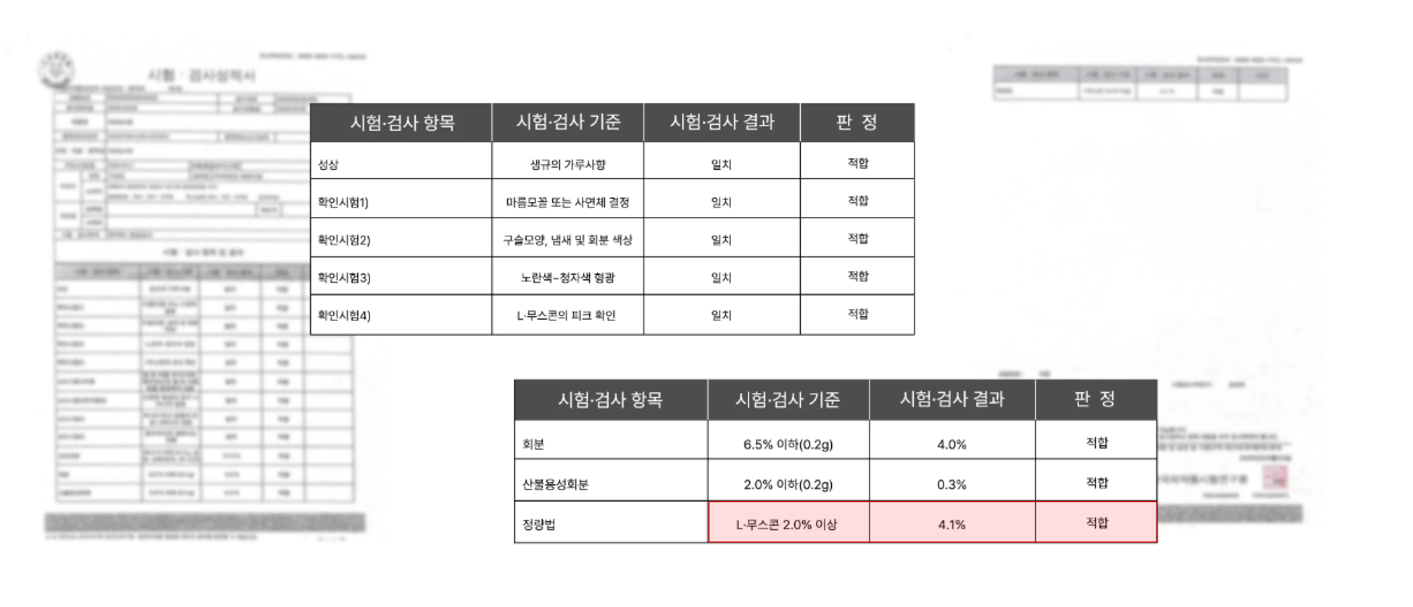 ▲ 시험·검사결과 무스콘함량 4.1% 적합 판정