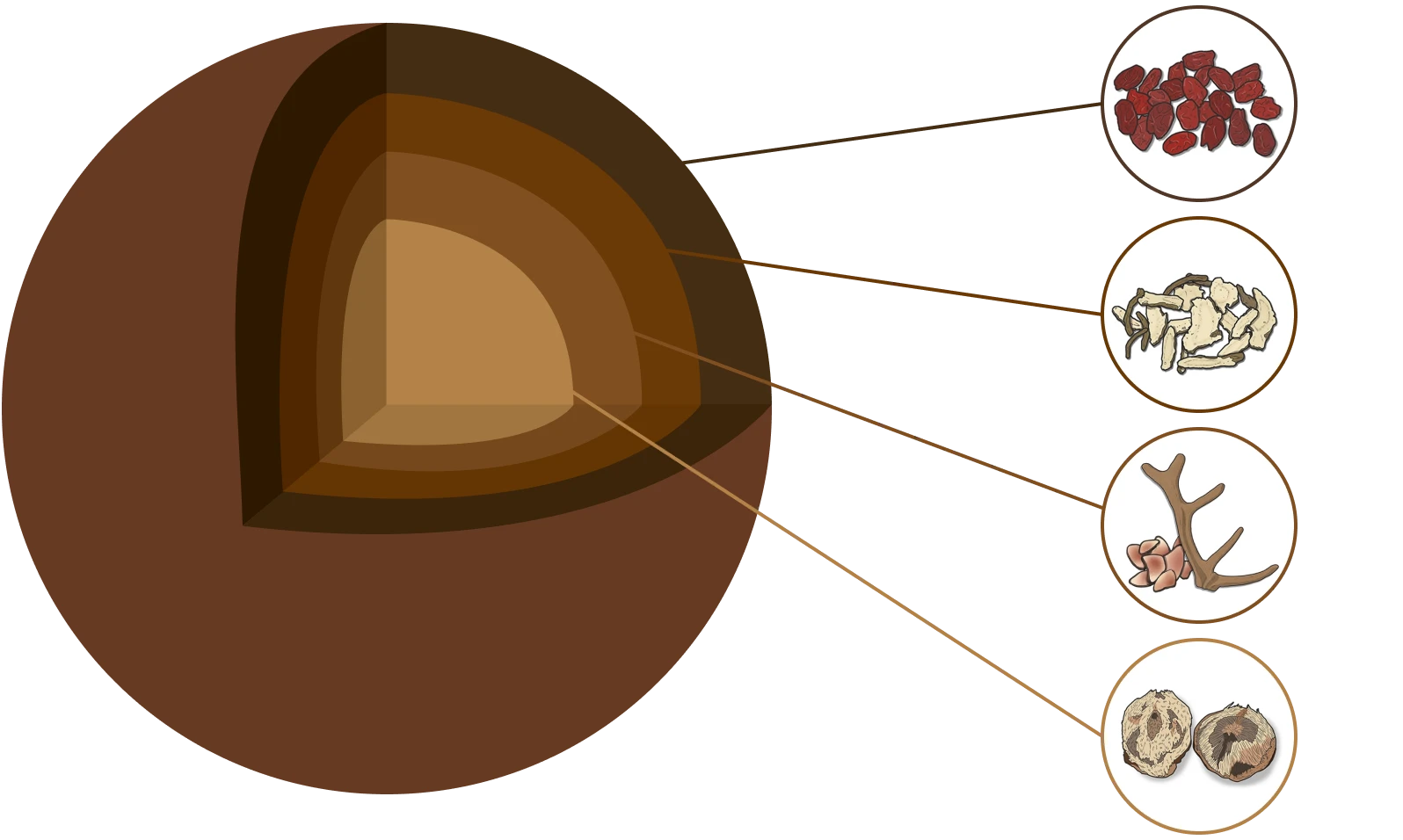 두개골을 뚫고 하루에 2cm를 자라나는 녹용은 양기를 북돋는 약재 중 끝판왕이라고 할 수 있습니다. 식욕, 성욕과 같은 본능적인 욕구들을 북돋아 피로에 빼앗긴 내 삶의 주인공 자리를 되찾게 만들어주는 약입니다.