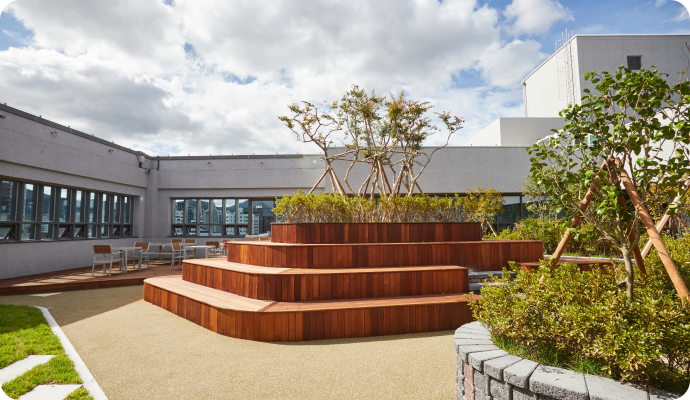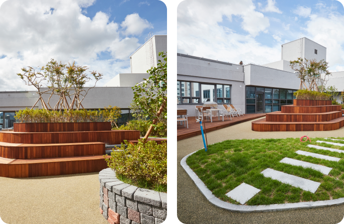 옥상 정원에 24시간 운동 가능한 트랙을 적용하였고, 재활 중 넘어져도 다치지 않는