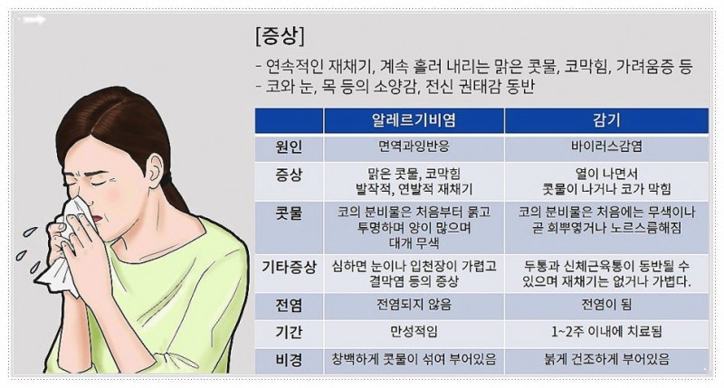아침엔 맑은 콧물이 흐르다가 오후에는 코가 막히는 현상.