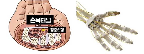 손목에는 ‘수근관(Carpal Tunnel)’이라는 좁은 통로가 있고, 이곳을 통해 손가락을 움직이는 힘줄과 정중신경(Median nerve)이 지나갑니다.