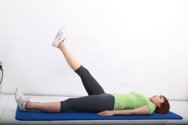 침대에 누워 다리를 무릎 펴고 천천히 들어올려보세요.