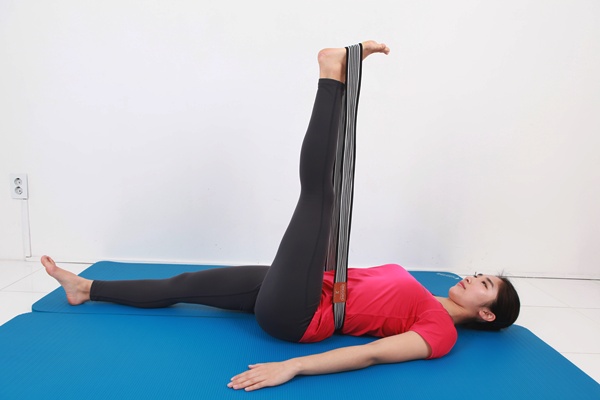 바닥에 누워 한쪽 다리를 위로 들어 올립니다.