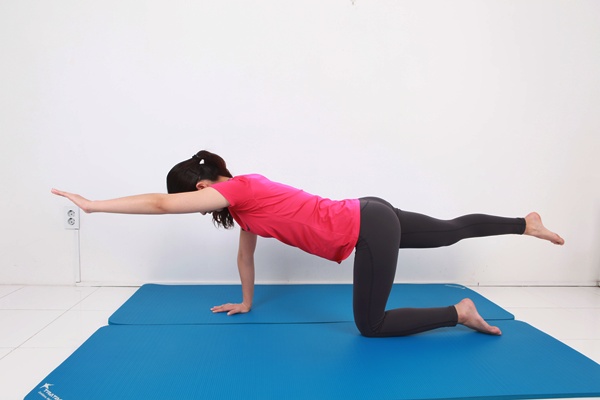 네발 기기 자세에서 한쪽 다리를 들어 올립니다.