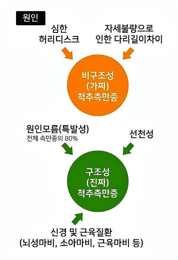 성인 척추측만증은 크게 두 가지로 나눌 수 있습니다.