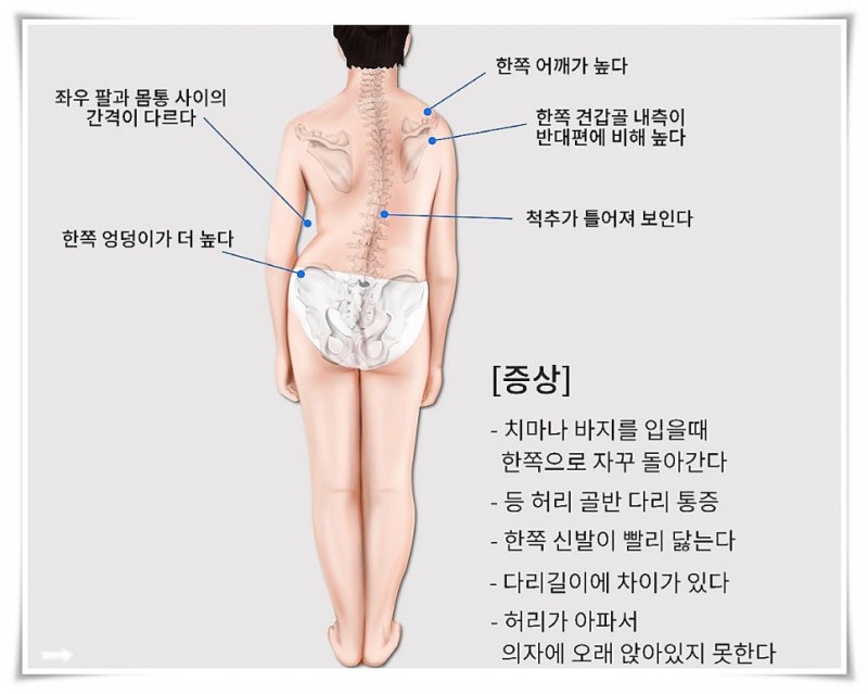 이 경우 어깨나 골반의 높이가 다르게 보이기도 하고, 아이가 한쪽으로 기운 자세를 취할 수 있어요.