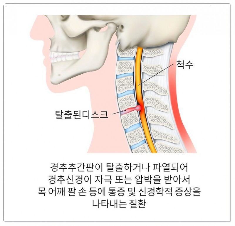 쉽게 말해, 목뼈 사이의 디스크가 제자리에서 밀려나 신경을 압박하는 상태를 뜻합니다.