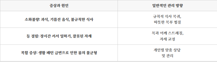 급격한 생활습관 변화가 위장과 근골격계에 동시에 영향을 주면서 나타나는 복합 증상이지요.