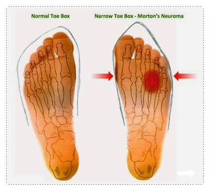 즉, 발 앞쪽 공간이 좁아지고 신경이 눌리기 때문이죠.